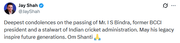 On social media, Jay Shah expressed his condolences on Bindra’s death, writing, “Deepest condolences on the passing of a legend of Indian cricket administration and former BCCI President, Shri I.S. Bindra. May his legacy continue to inspire future generations. Om Shanti.”